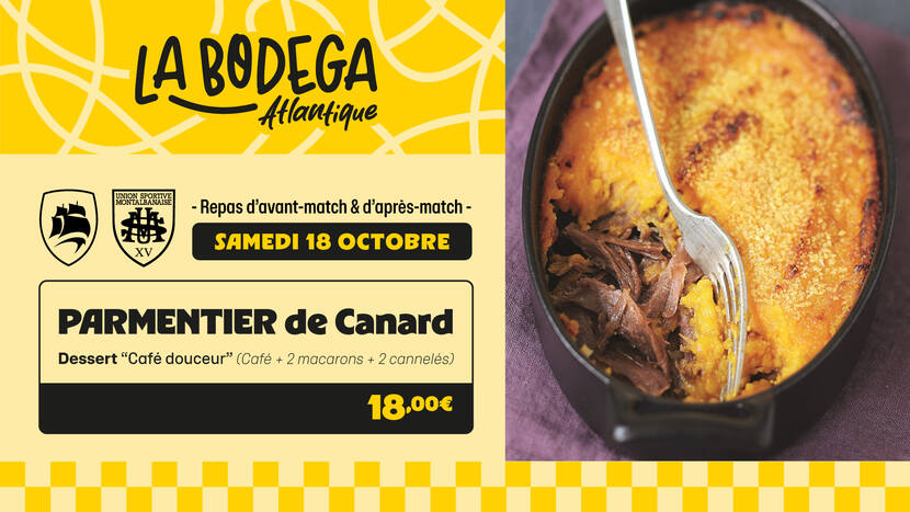 Comme à chaque rencontre de Top 14 à domicile, un repas vous est proposé en Bodega Atlantique : au menu, notre parmentier de canard, à déguster avant ou après le match suivi d'un café douceurs.
