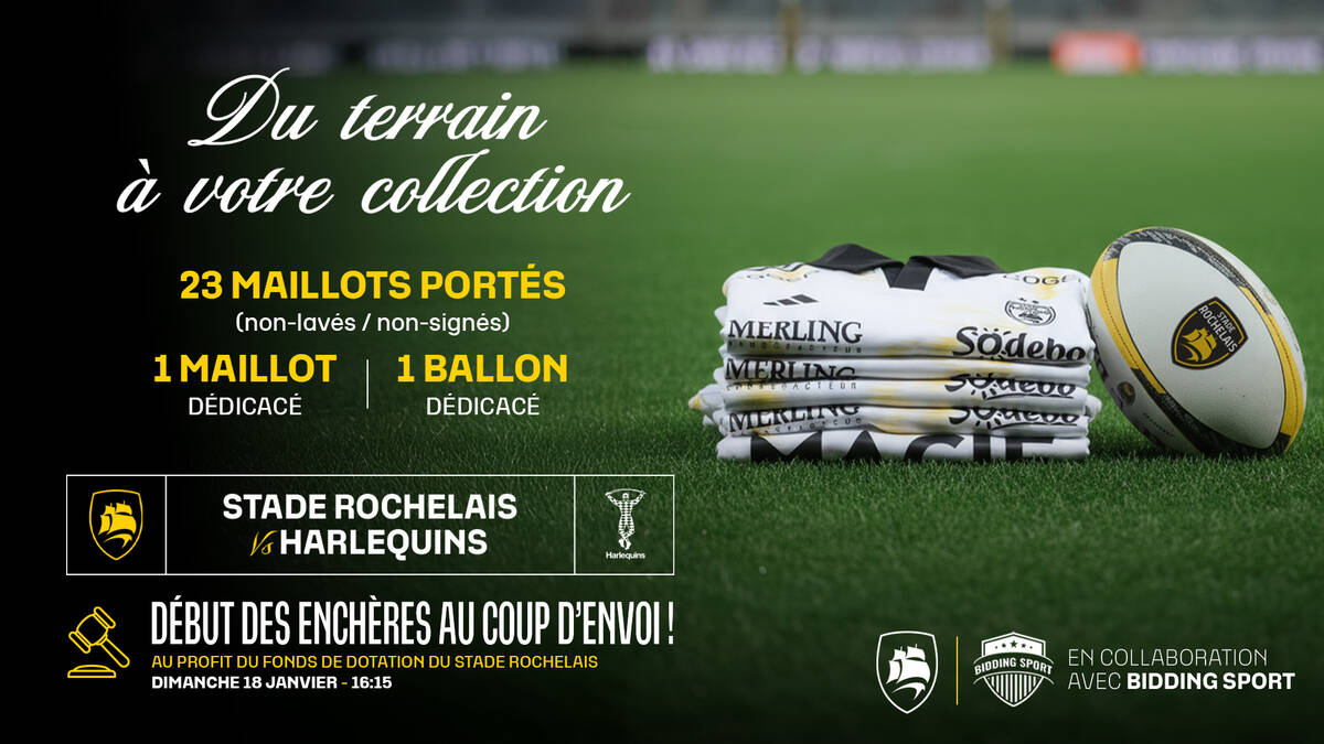 Le Club collabore avec Bidding Sport pour la première fois de la saison, à l'occasion d'une première vente aux enchères. Elle sera lancée au coup d’envoi du match face ax Harlequins, et l’intégralité des bénéfices sera reversée au Fonds de Dotation du Stade Rochelais. On vous en dit plus !