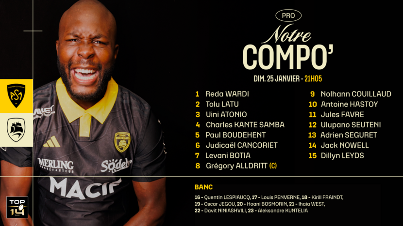 Le XV de départ : Reda WARDI, Tolu LATU, Uini ATONIO, Charles KANTE SAMBA, Paul BOUDEHENT, Judicaël CANCORIET, Levani BOTIA, Grégory ALLDRITT (cap), Nolhann COUILLAUD, Antoine HASTOY, Jules FAVRE, Ulupano SEUTENI, Adrien SEGURET, Jack NOWELL, Dillyn LEYDS.