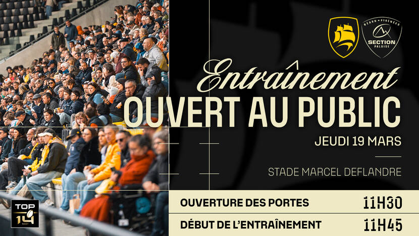 C'est le retour des entraînements ouverts au public ! Pour l'occasion, nos Rochelais vous donnent rendez-vous le jeudi 19 mars, en fin de matinée, au Stade Marcel Deflandre ! Dès 11h30, venez encourager vos joueurs avant la réception de la Section Paloise.