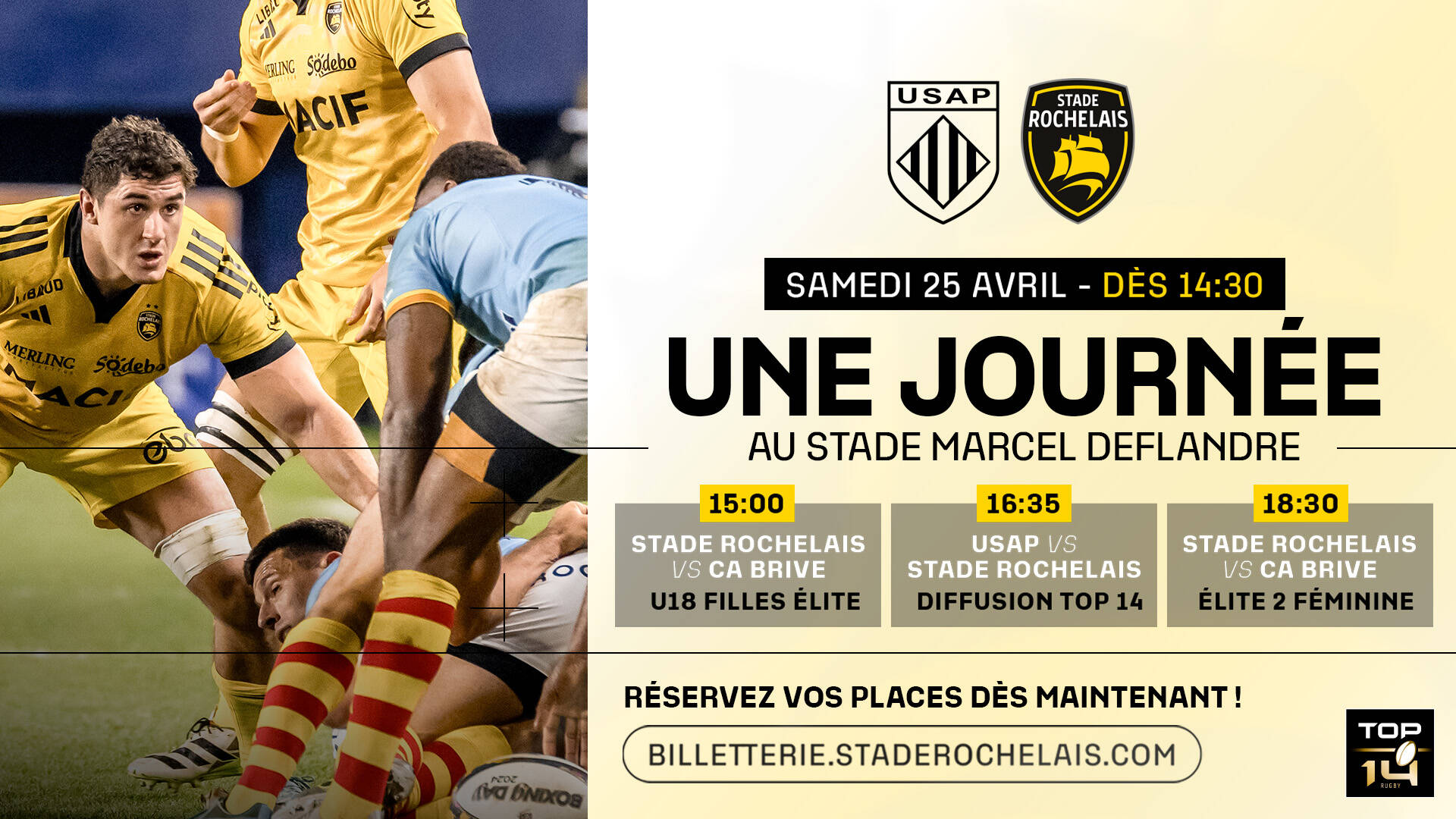 - 18h30 : Élite 2 Stade Rochelais vs Élite 2 CA Brive