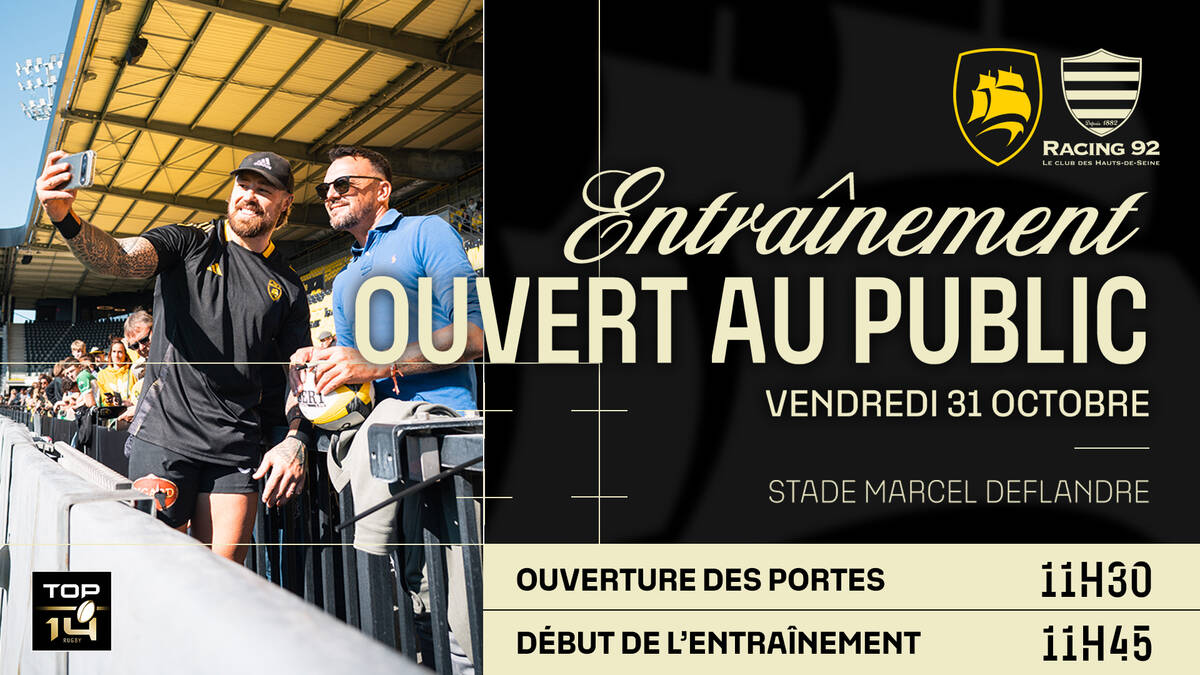 Avant la réception du Racing 92, les Rochelais vous donnent rendez-vous en fin de matinée le vendredi 31 octobre, pour un entraînement ouvert au public, sur la pelouse du Stade Marcel Deflandre ! Ouverture des portes à 11h30 !